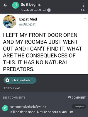The Roomba killed me. I always had the same thought of what would happen. I want that mug.